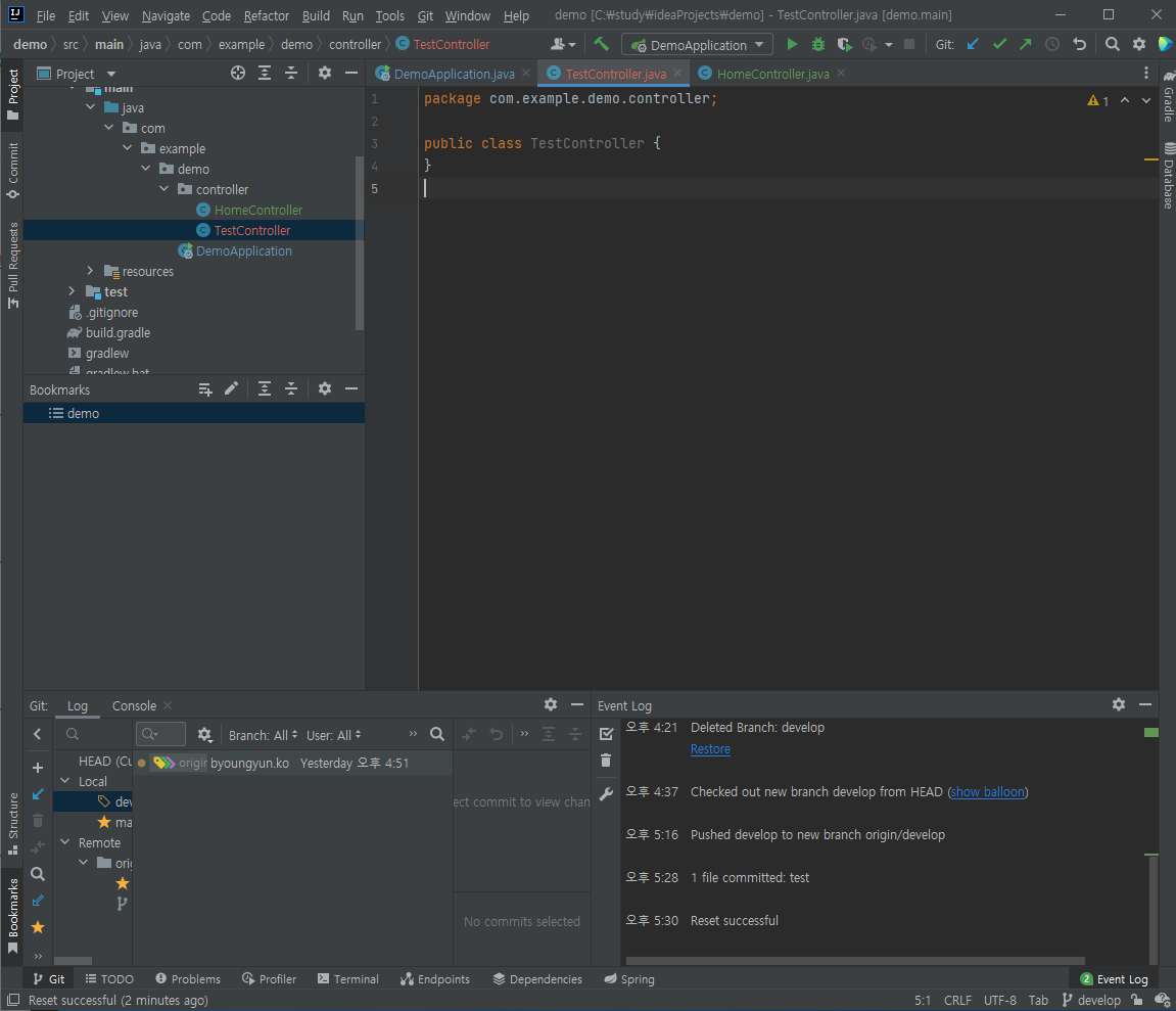 우측 상단의 Push 버튼(녹색 화살표 모양 버튼)을 클릭해서 Push를 완료하면 Remote에도 develop Branch가 생성된다.