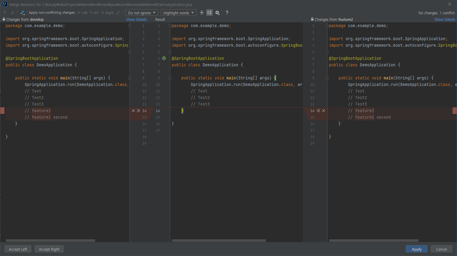 Conflict가 발생하면 아래와 같은 팝업이 호출되는데 왼쪽과 오른쪽을 참고해서 가운데를 적당하게 수정해주면 가운데의 소스로 적용이 된다.